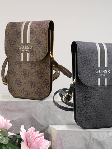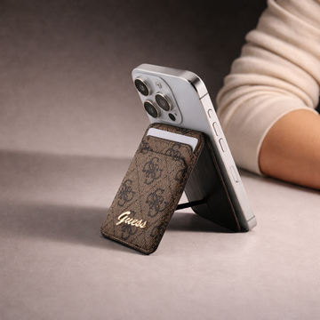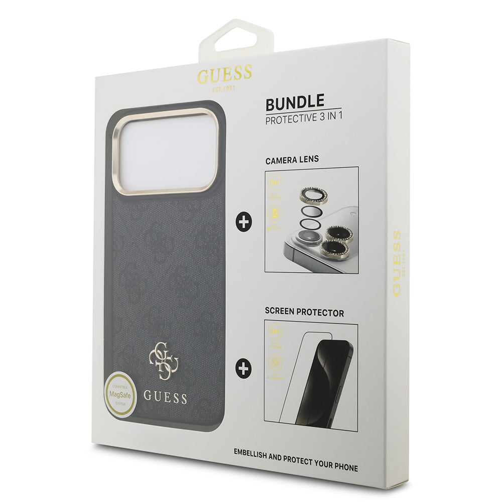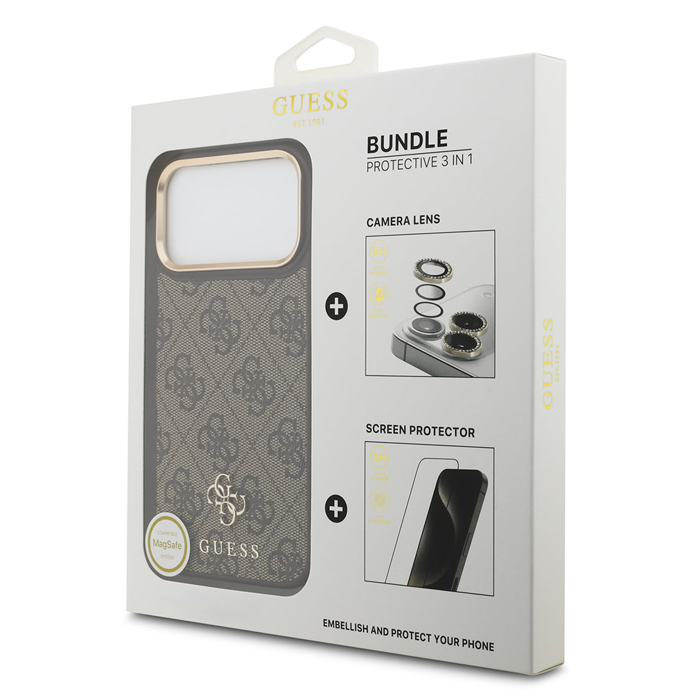 Apple iPhone 17 Pro Kılıf Guess Gold Metal Kamera Çerçeveli Büyük 4G ve Yazı Logolu Kapak Kahverengi