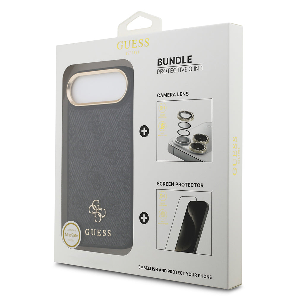 Apple iPhone 17 Guess 3'lü Aksesuar Seti 4G ve Yazı Logolu Kılıf Ekran ve Lens Koruyucu Siyah