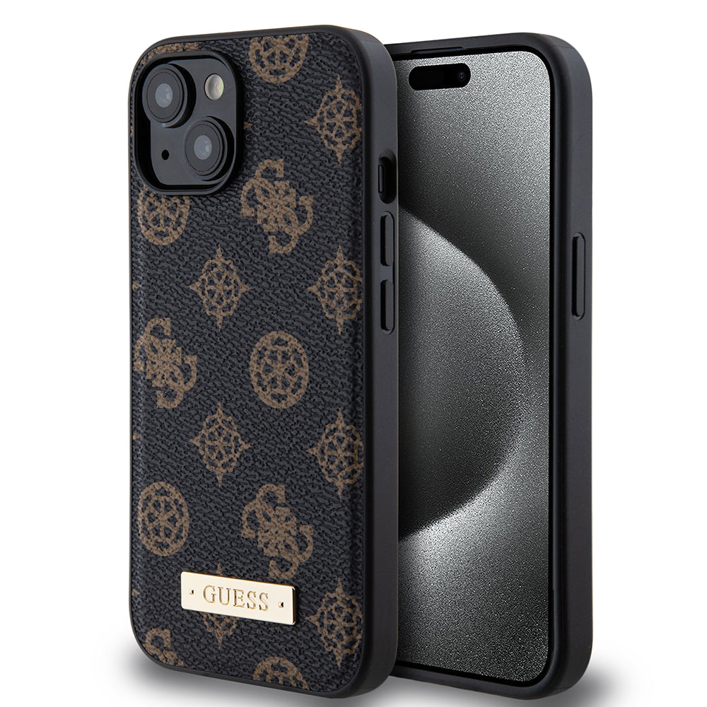 Apple iPhone 15 Plus Kılıf Guess 4G Büyük Metal Logolu Askılı Kapak Kahverengi