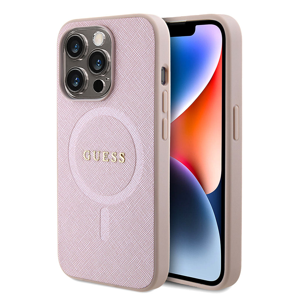 Apple iPhone 15 Pro Max Kılıf Guess Magsafe Şarj Özellikli Saffiano Kapak Pembe