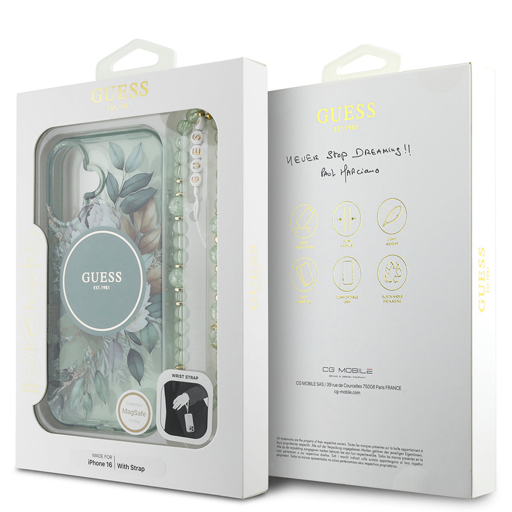 Apple iPhone 16 Kılıf Guess Magsafe Şarj Özellikli IML Baskılı Çiçek İnci Bileklikli Kapak Yeşil