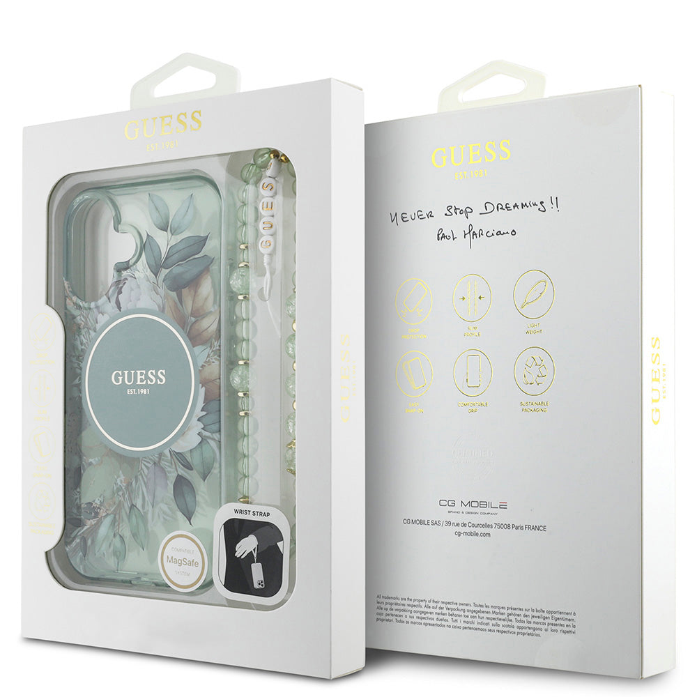 Apple iPhone 16 Plus Kılıf Guess Magsafe Şarj Özellikli IML Baskılı Çiçek İnci Bileklikli Kapak Yeşil