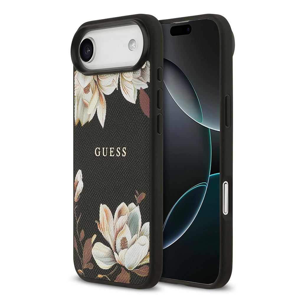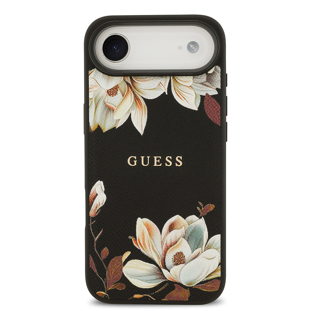 Apple iPhone 17 Air Kılıf Guess M-Safe Şarj Özellikli Çiçek Tasarımlı Metal Yazı Logolu Kapak Siyah