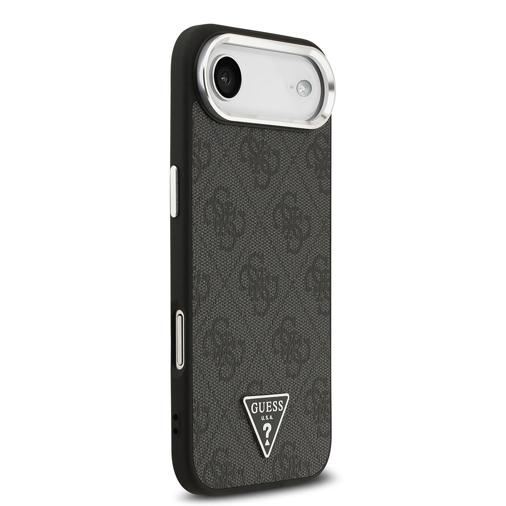 Apple iPhone 17 Air Kılıf Guess M-safe Şarj Özellikli Gümüş Metal Çerçeveli Üçgen Logo 4G Desenli Kapak Siyah
