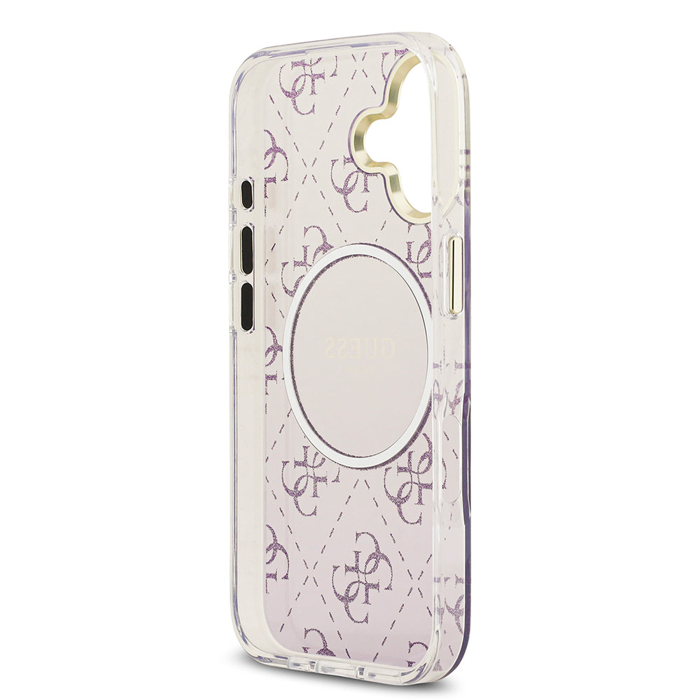 Apple iPhone 17 Kılıf Guess M-safe Şarj Özellikli 4G Desenli Simli Transparan Kapak Mor