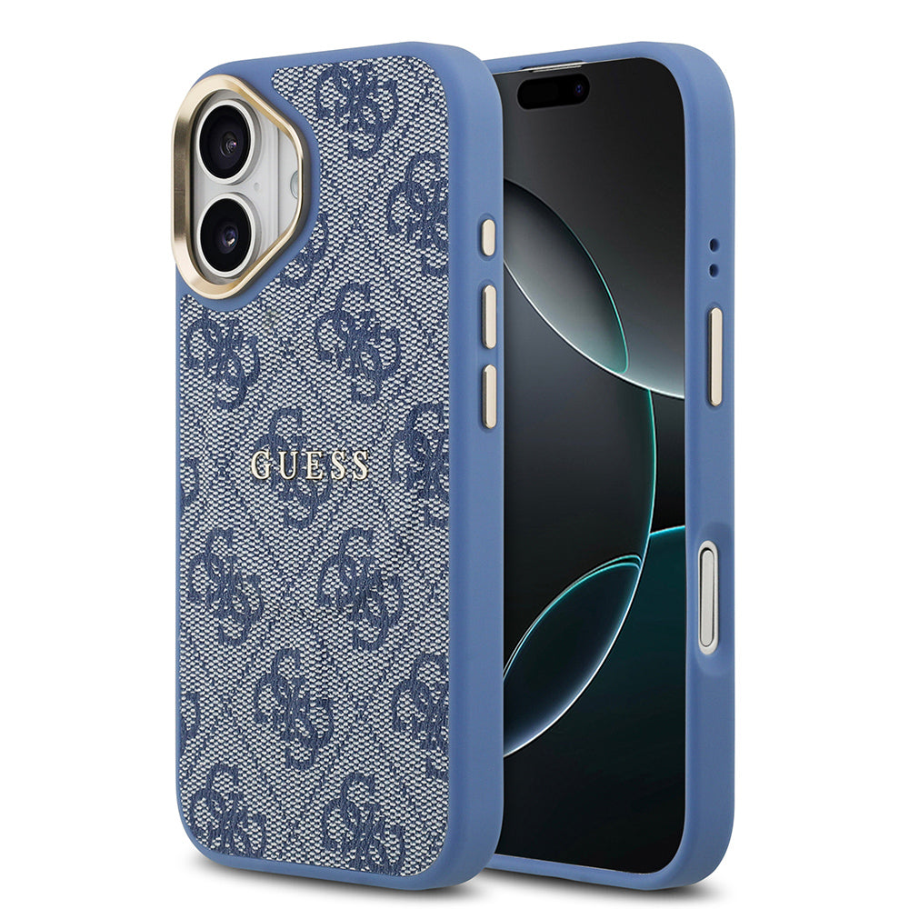 Apple iPhone 17 Kılıf Guess M-safe Şarj Özellikli Gold Metal Kamera Çerçeveli PU Deri 4G Desen Yazı Logolu Kapak Mavi