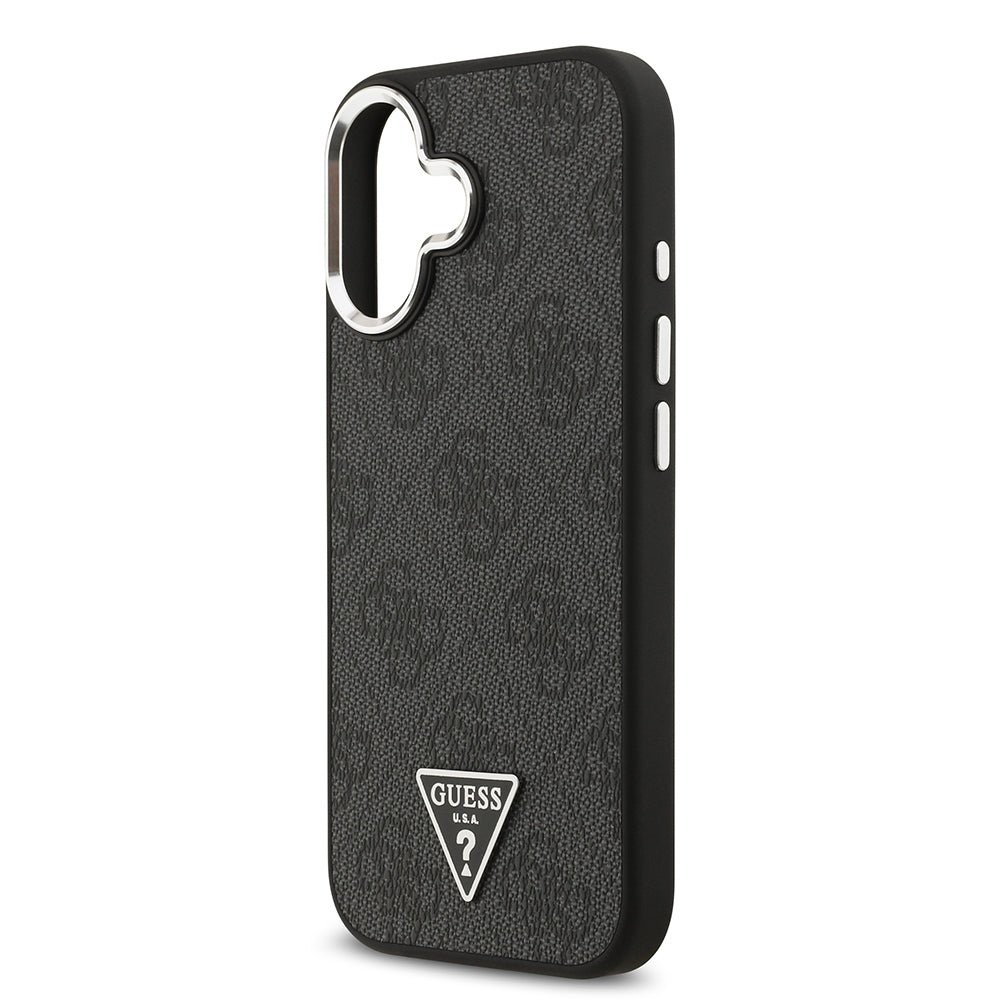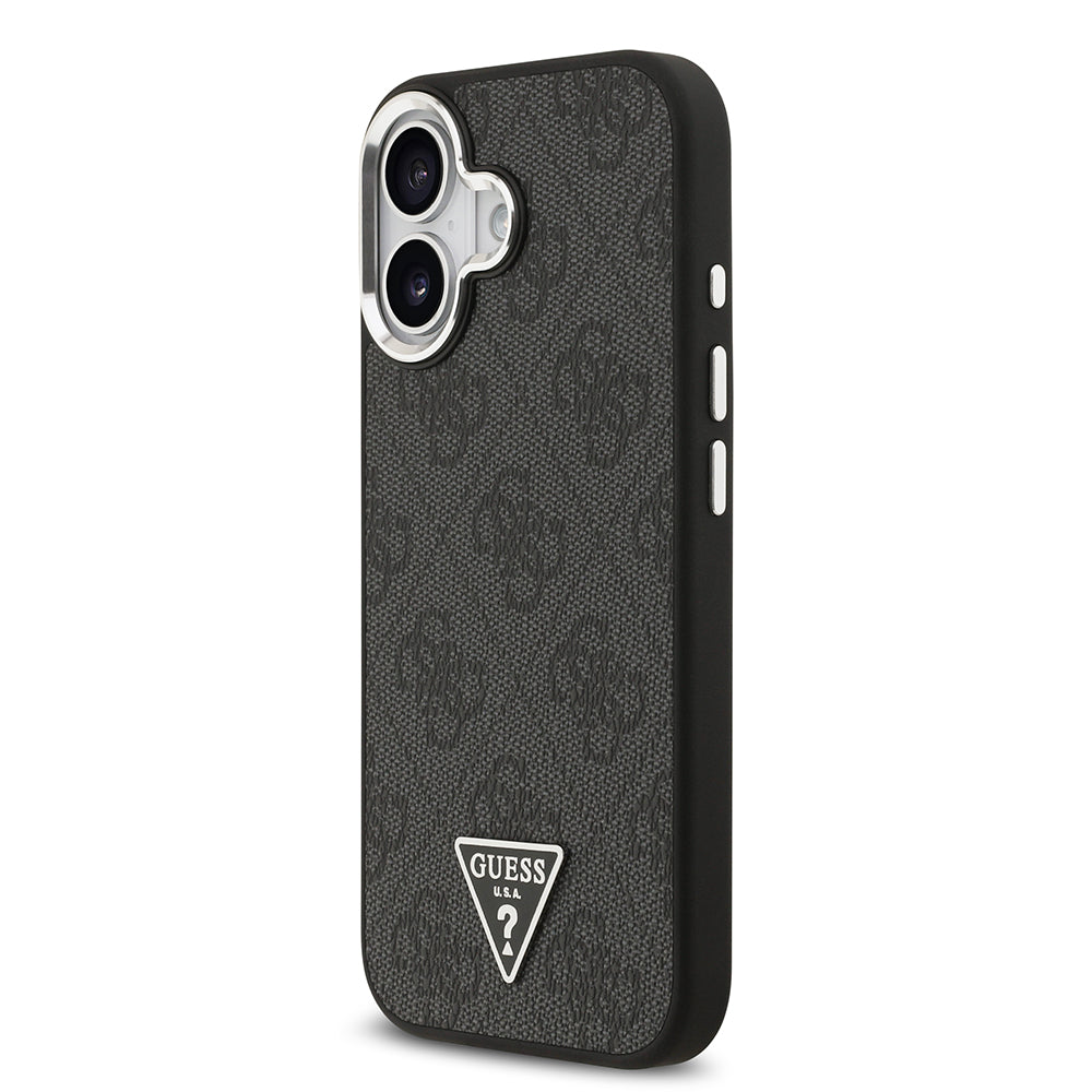 Apple iPhone 17 Kılıf Guess M-safe Şarj Özellikli Gümüş Metal Çerçeveli Üçgen Logo 4G Desenli Kapak Siyah