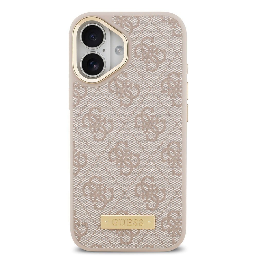 Apple iPhone 17 Kılıf Guess Magsafe Şarj Özellikli 4G Desenli PU Metal Plaka Klasik Logolu Kapak Pembe