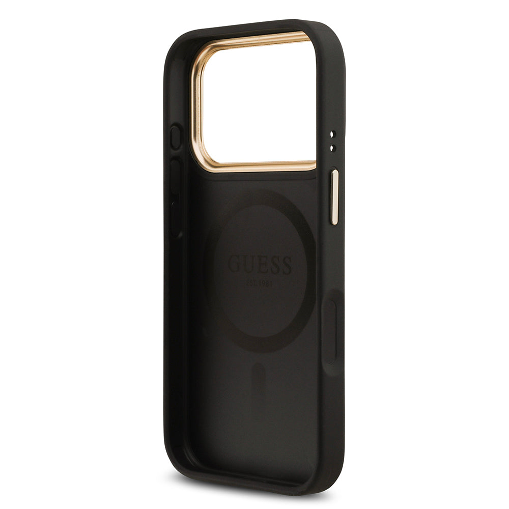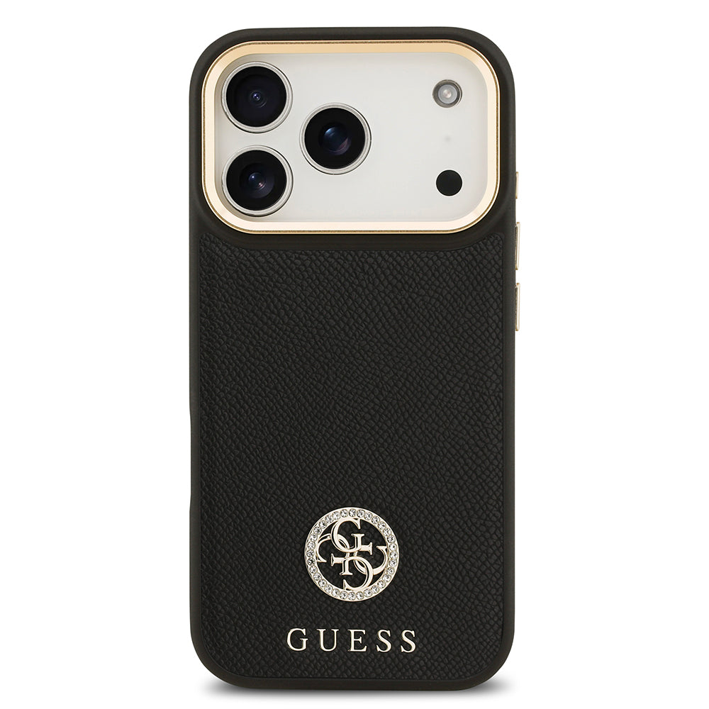 Apple iPhone 17 Pro Kılıf Guess M-safe Özellikli Grained Yazı ve Taşlı 4G Logolu Kapak Siyah