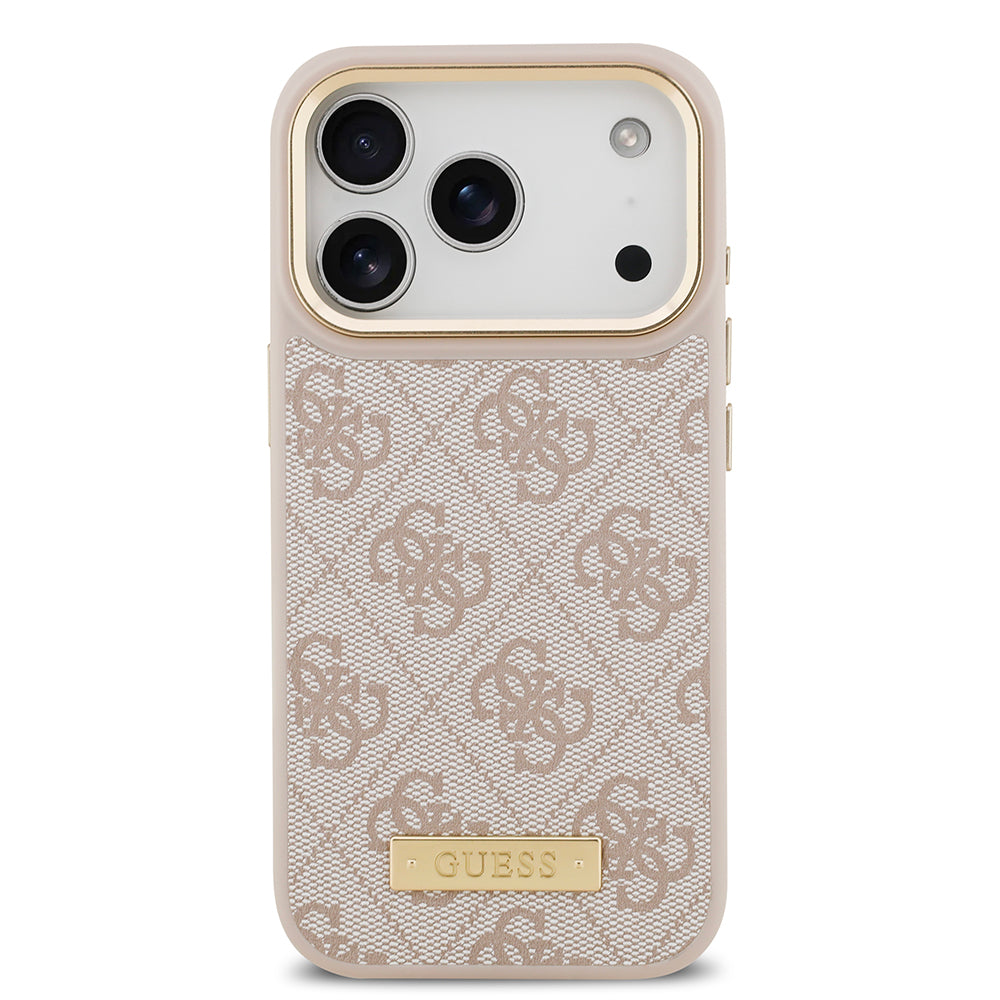 Apple iPhone 17 Pro Kılıf Guess Magsafe Şarj Özellikli 4G Desenli PU Metal Plaka Klasik Logolu Kapak Pembe
