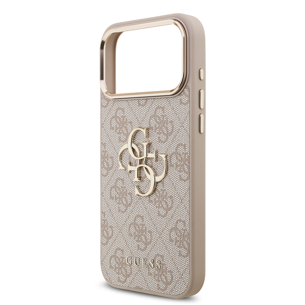 Apple iPhone 17 Pro Max Kılıf Guess Gold Metal Kamera Çerçeveli Büyük 4G ve Yazı Logolu Kapak Pembe
