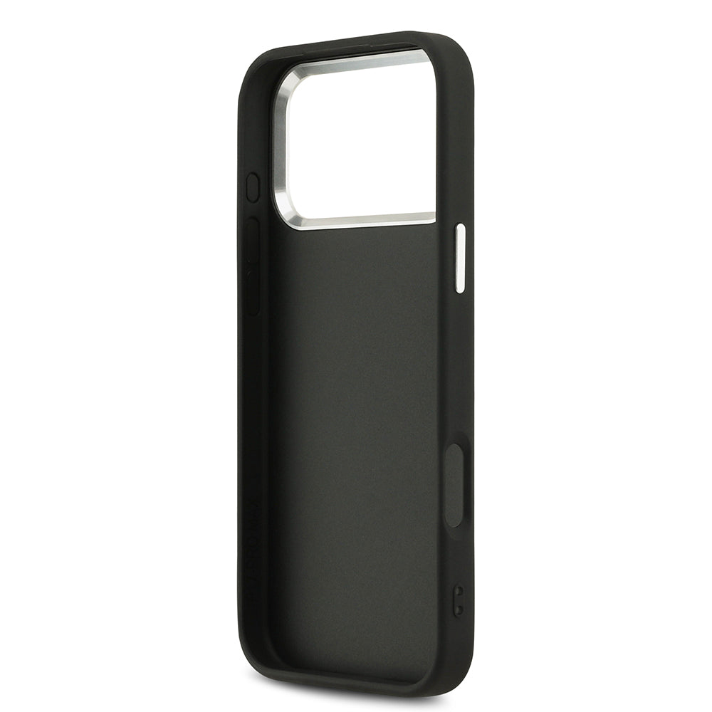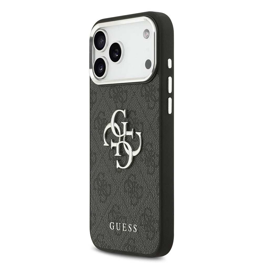 Apple iPhone 17 Pro Max Kılıf Guess Gümüş Metal Kamera Çerçeveli Büyük 4G ve Yazı Logolu Kapak Siyah