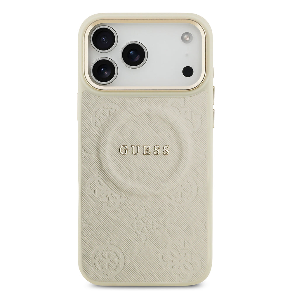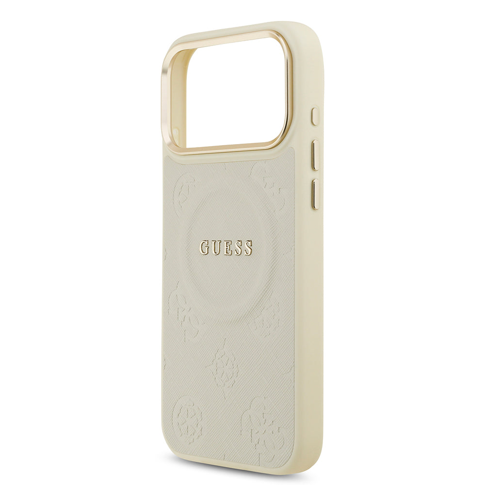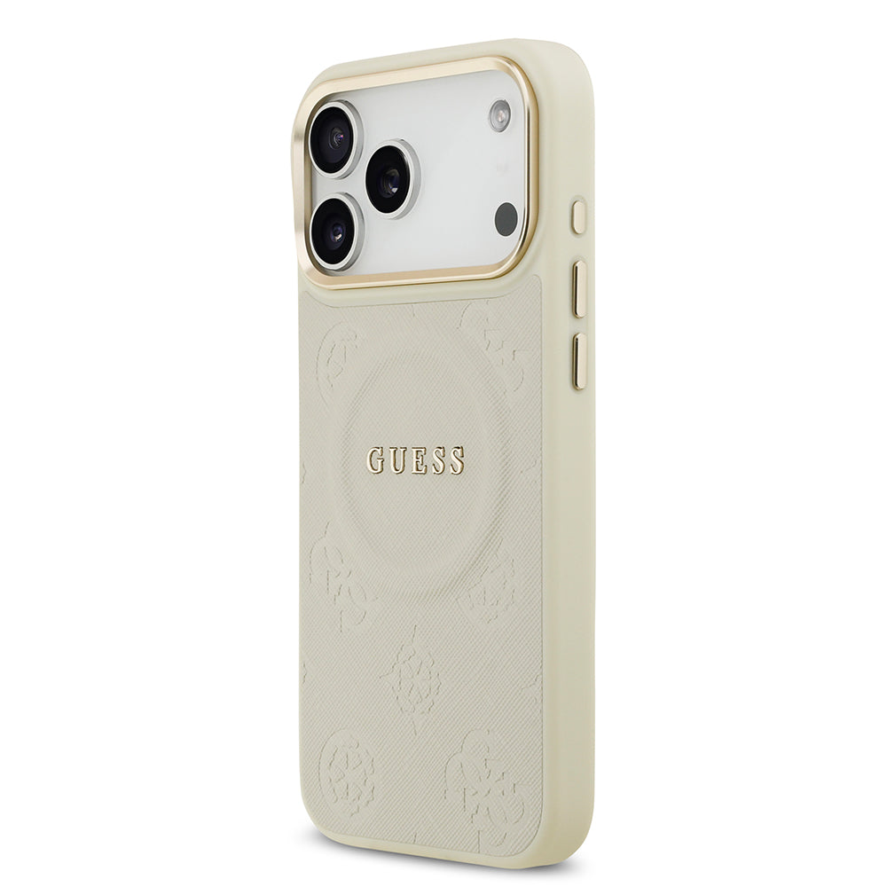 Apple iPhone 17 Pro Max Kılıf Guess M-safe Özellikli Yazı Logolu PU Deri Peony Kapak Bej