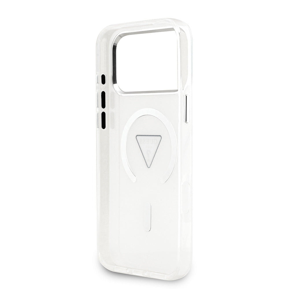 Apple iPhone 17 Pro Max Kılıf Guess M-safe Şarj Özellikli IML Baskılı Üçgen Logolu Metal Kamera Çerçeveli Transparan Kapak Şeffaf