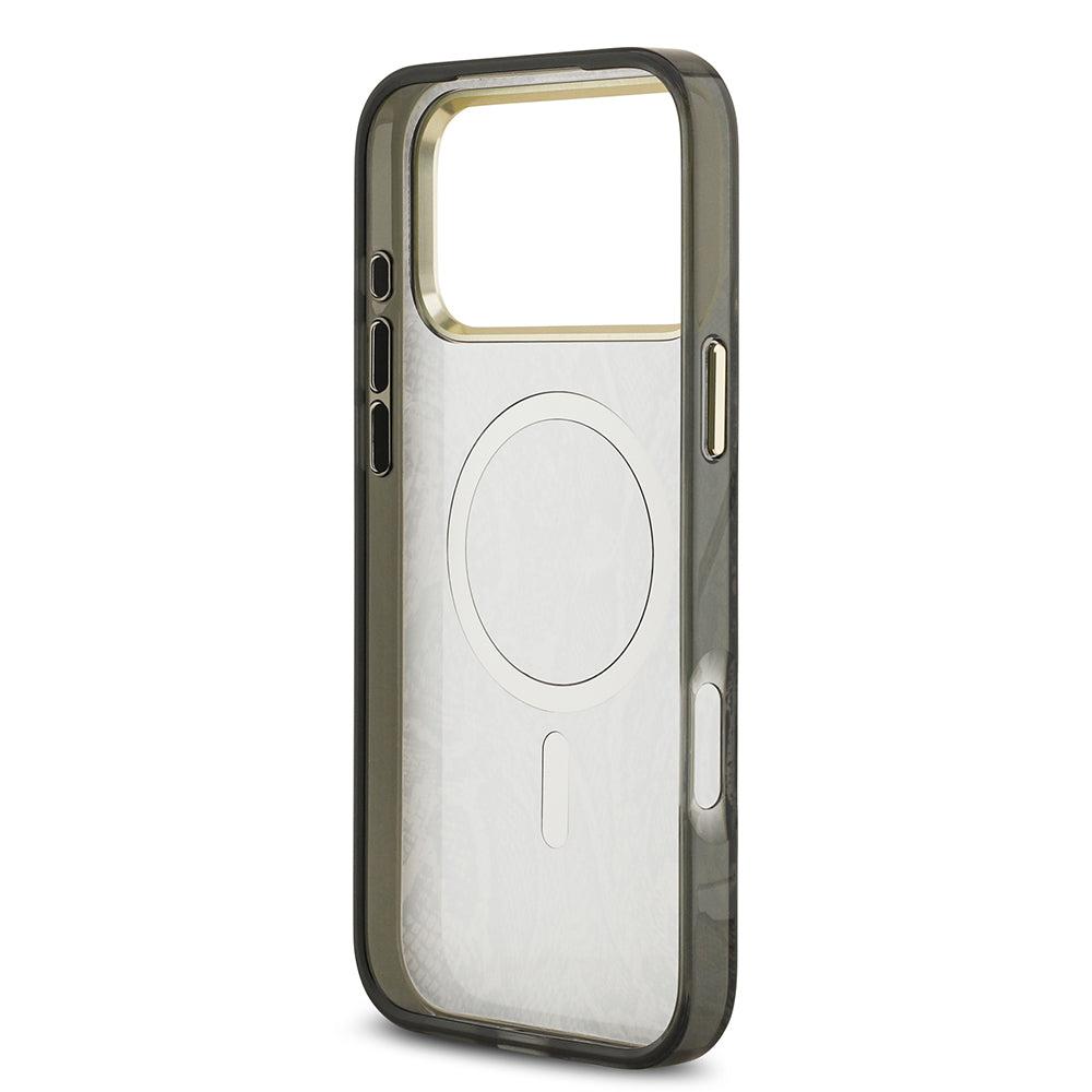 Apple iPhone 17 Pro Max Kılıf Guess M-safe Şarj Özellikli Yazı Logolu Python Yılan Desenli Kapak Siyah