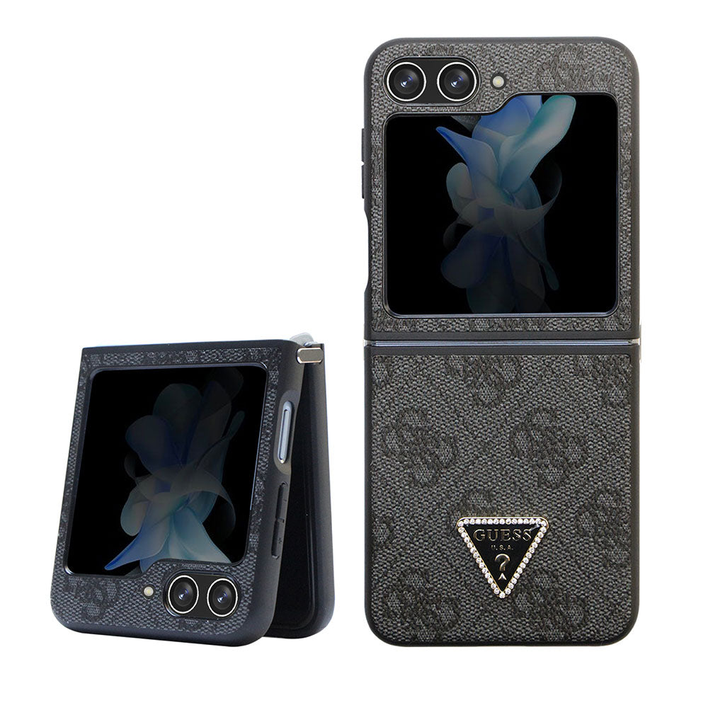 Galaxy Z Flip 5 Kılıf Guess PU Deri Taşlı Üçgen Logolu 4G Desenli Strass Kapak Siyah