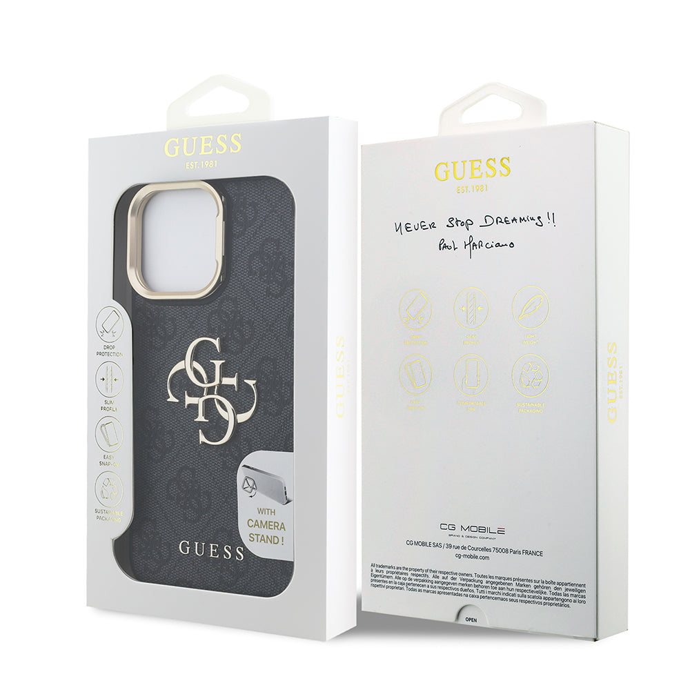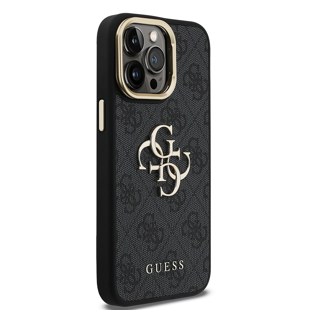 Apple iPhone 13 Pro Max Kılıf Guess Kamera Standlı Kapak 4G Desenli Metal 4G Logolu Siyah