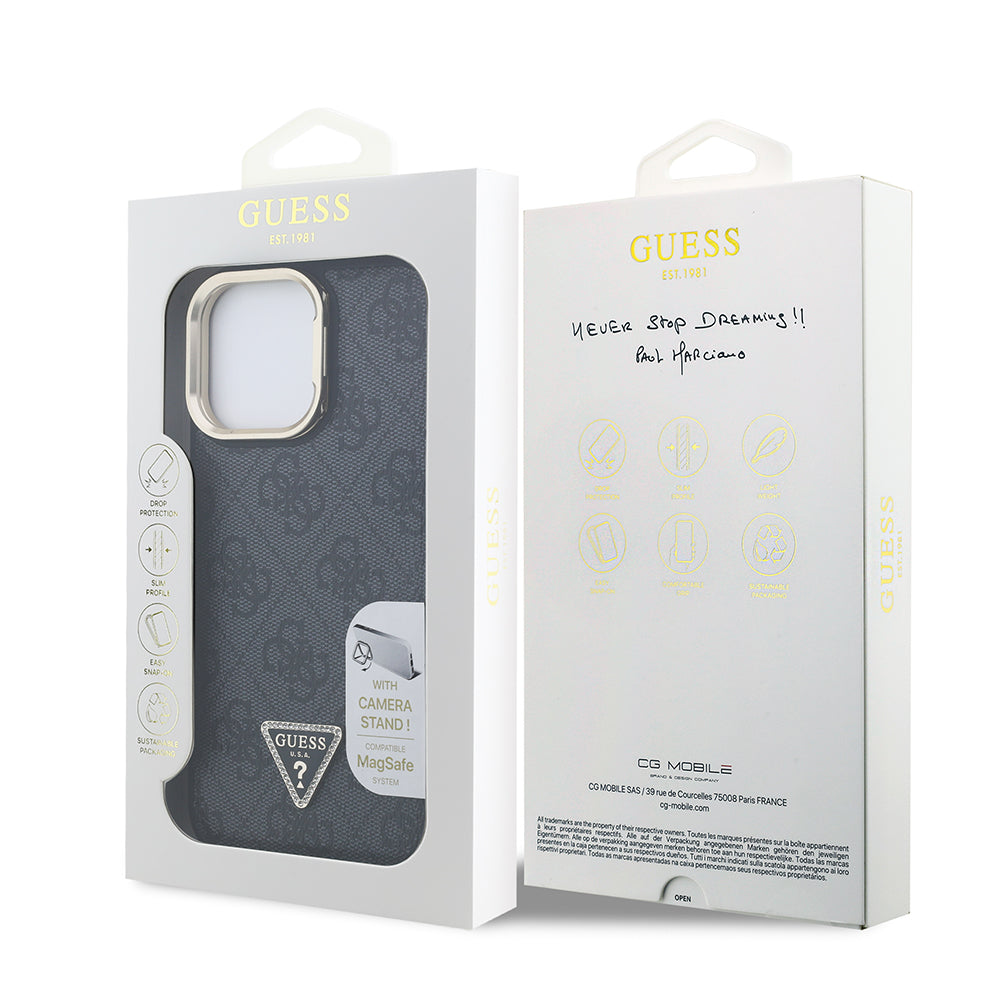 Apple iPhone 13 Pro Max Kılıf Guess Kamera Standlı M-Safe Özellikli Kapak Üçgen Logo 4G Desenli Siyah