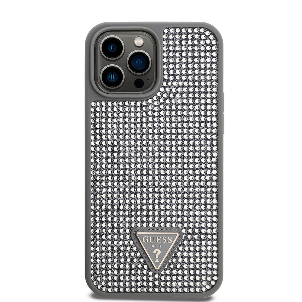 Apple iPhone 13 Pro Max Kılıf Guess Üçgen Logolu Rhinestone Taşlı Kapak Gümüş