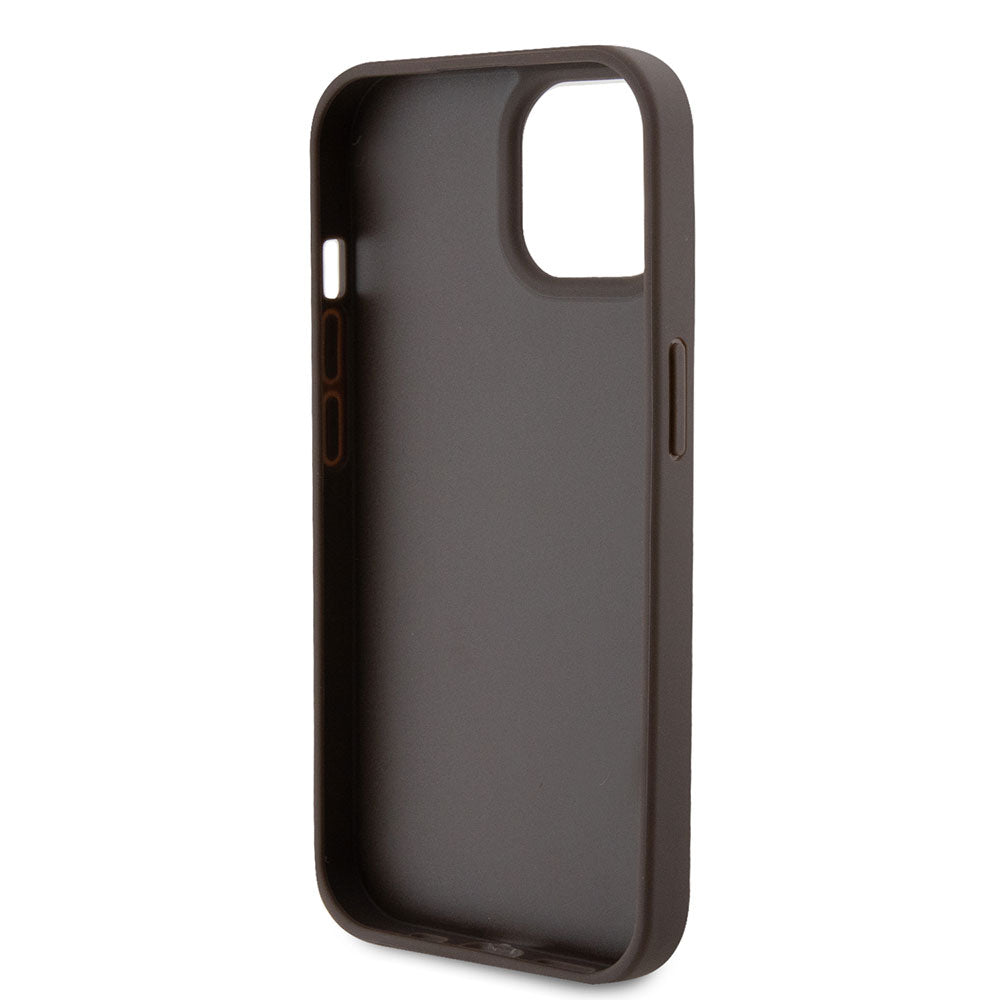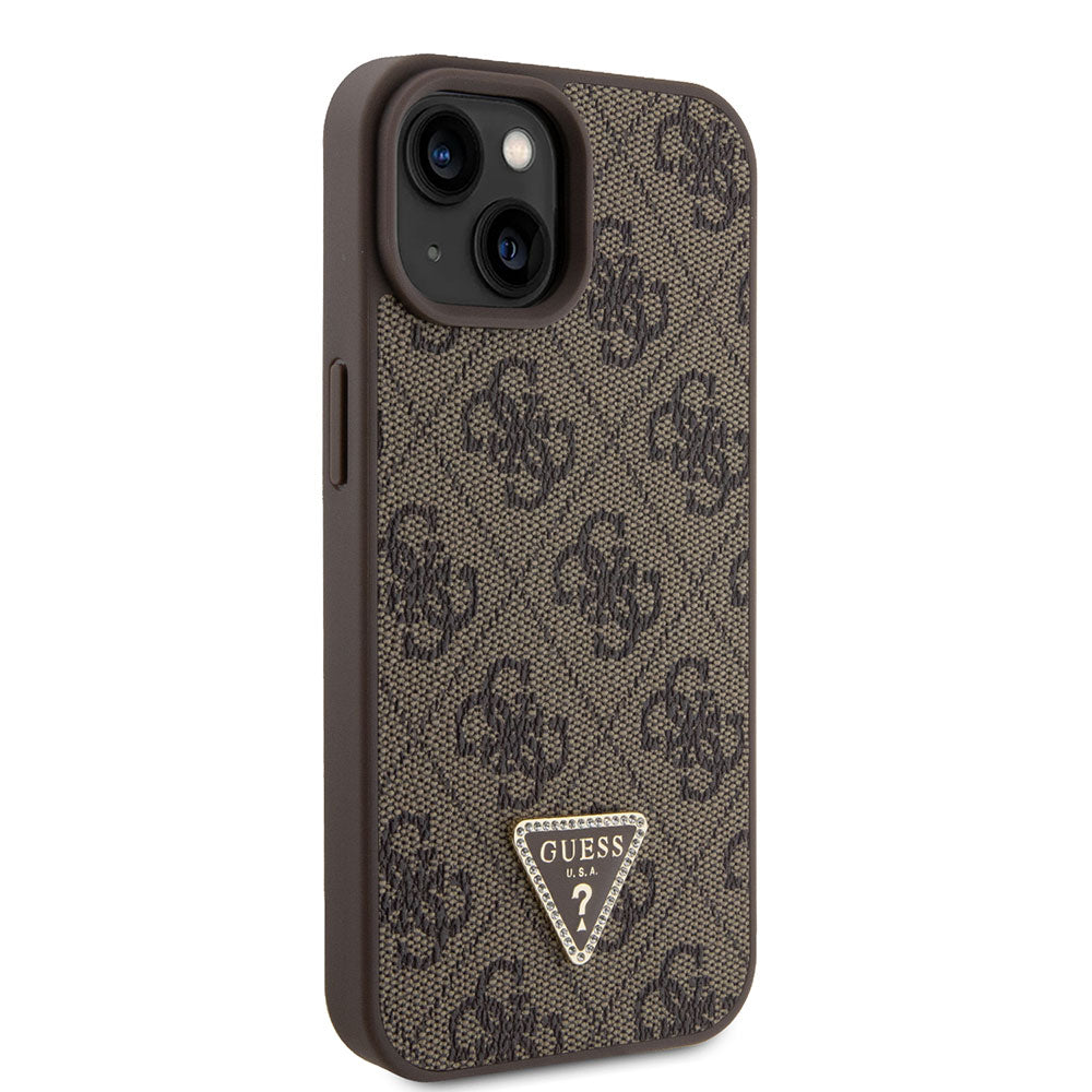 Apple iPhone 15 Plus Kılıf Guess PU Deri Taşlı Üçgen Logolu 4G Desenli Strass Kapak Kahverengi