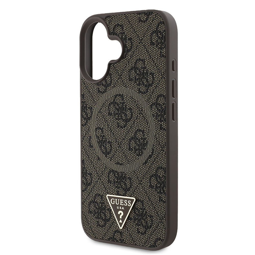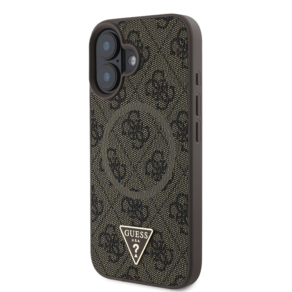 Apple iPhone 16 Kılıf Guess Magsafe Şarj Özellikli PU Üçgen Logolu 4G Desenli Kapak Kahverengi