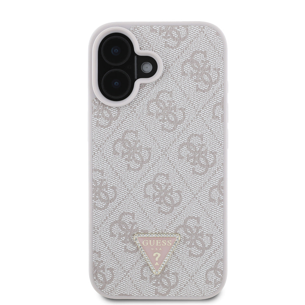 Apple iPhone 16 Plus Kılıf Guess PU Deri Taşlı Metal Üçgen Logolu Çapraz Vücut Askılı 4G Desenli Kapak Pembe