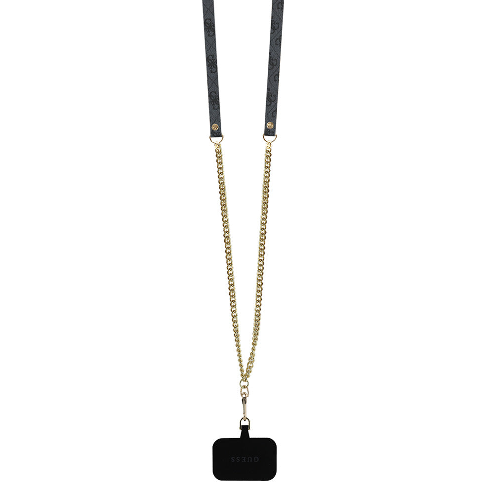 Apple iPhone 16 Pro Kılıf Guess PU Deri Taşlı Metal Üçgen Logolu Çapraz Vücut Askılı 4G Desenli Kapak Siyah