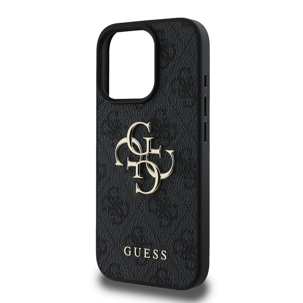 Apple iPhone 16 Pro Max Kılıf Guess PU Deri 4G Desenli Metal Büyük 4G ve Yazı Logolu Kapak Siyah